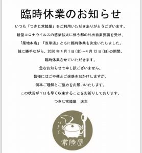 「築地本店」「浅草店」ともに臨時休業を決定いたしました。
